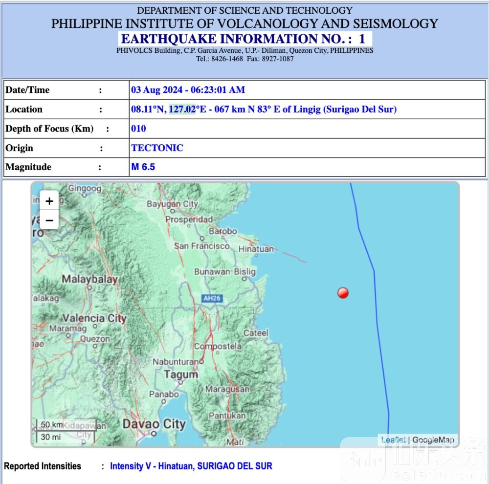 伯乐头条专讯:当地时间8月3日早上6点23分,菲律宾南苏里高省(Surigao del Sur)Lingig镇东部外海发生6.5级地震。