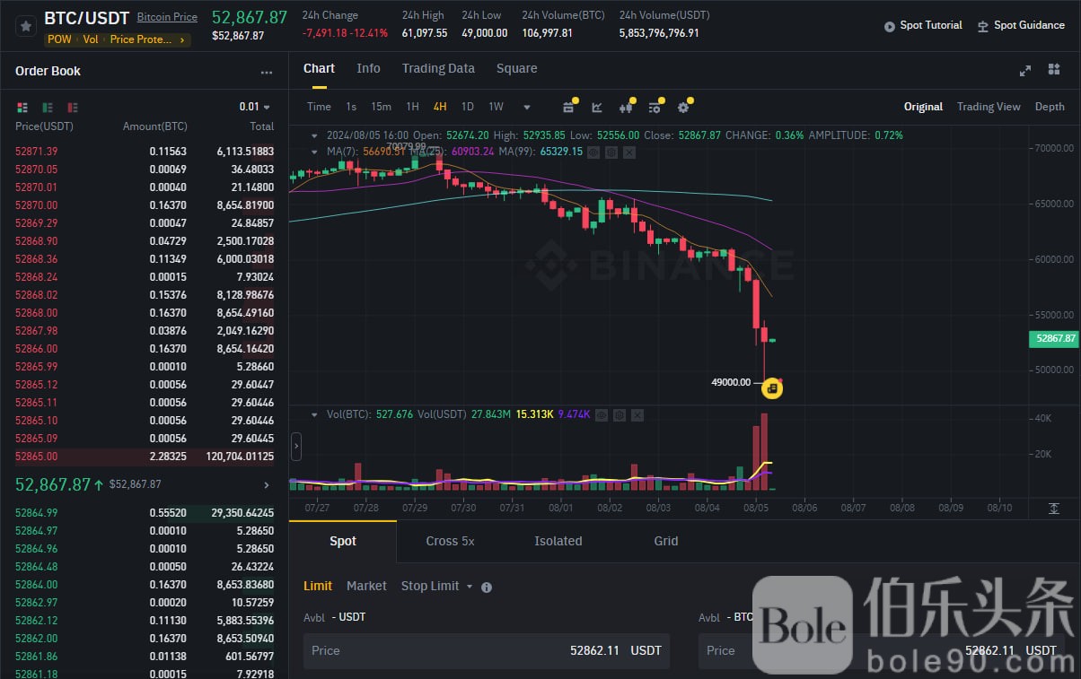 伯乐头条专讯:继8月4日跌破60000美元后,比特币在8月5日8时左右突然再度跳水,一度跌破53000美元,创下近几个月新低。截至发稿,比特币最新价格再度跌破53000美元,24小时跌幅超10%。